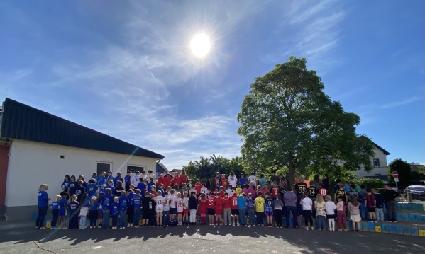 Am Mittwoch, den 07. Juni 2023 zeigten sich unsere 240 Schülerinnen und Schüler bei den Bundesjugendspielen von ihrer sportlichen Seite. Alle Klassen liefen gemeinsam um 8 Uhr von der Schule an der Gründau zum Thermo Fisher Stadion, um sich dort mit einem Tanz für die bevorstehenden Aufgaben aufzuwärmen und einzustimmen.