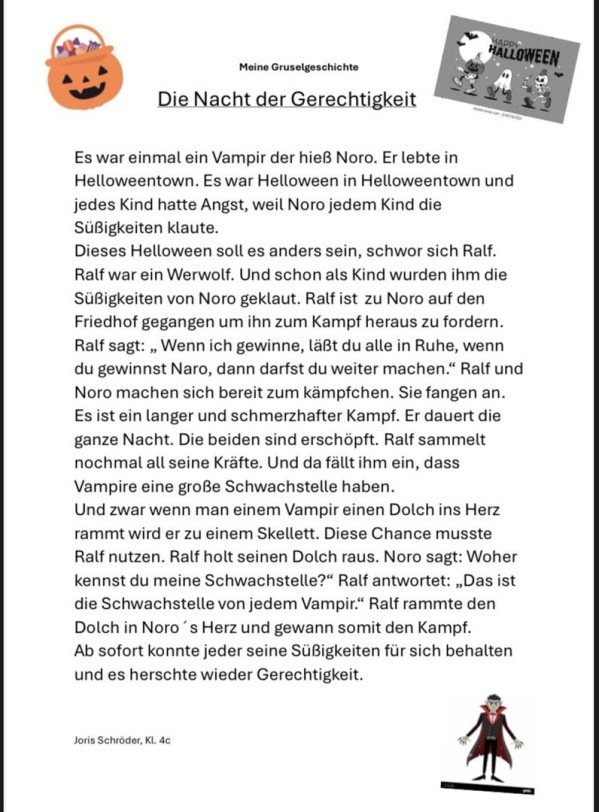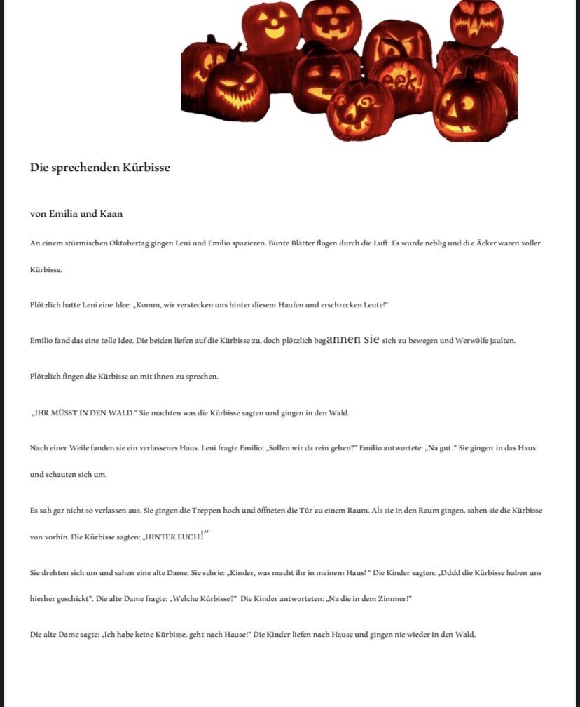 Die Kinder der Klasse 4c schreiben Gruselgeschichten und gestalten gruselige Kürbisse mit ihrer Patenklasse.