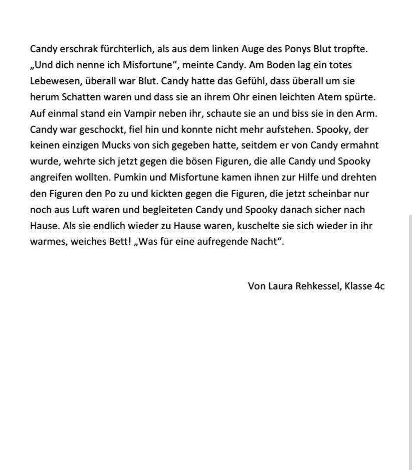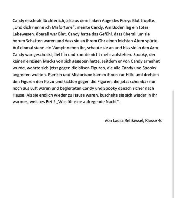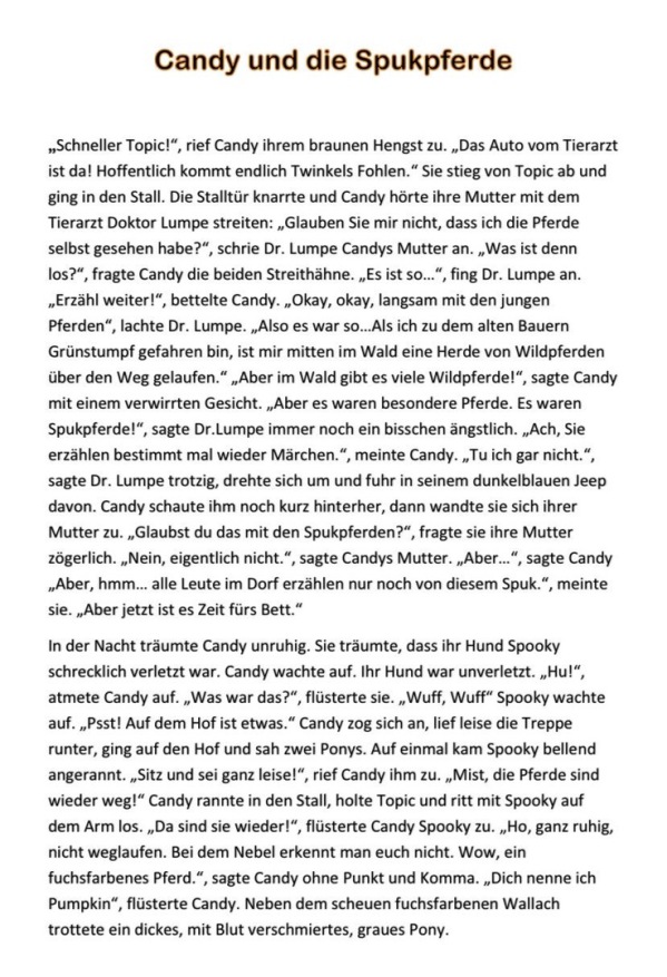 Dichter Nebel zog über den dunklen Wald, es dämmerte schon. Bei Vollmond tauchte eine seltsame Gestalt auf. Sie ritt auf einem Pferd und hatte eine Ritterrüstung an. Das Wiehern von dem weißen Pferd hörte sich an wie ein Schrei. Man sagte sich, dass es ein Geisterreiter sei, aber niemand wusste es genau. Wohin er bei den ersten Sonnenstrahlen verschwand, das wusste auch niemand. Eines abends aber fand jemand im Wald ein weißes Pferd, es sah aus wie das Geisterpferd. Neben dem Pferd lag eine Ritterrüstung. Lange erzählte man sich, dass es das Geisterpferd und der Geisterreiter waren, aber eines Tages waren das Pferd und die Rüstung weg. Niemand wusste, wo sie hinverschwunden sind.